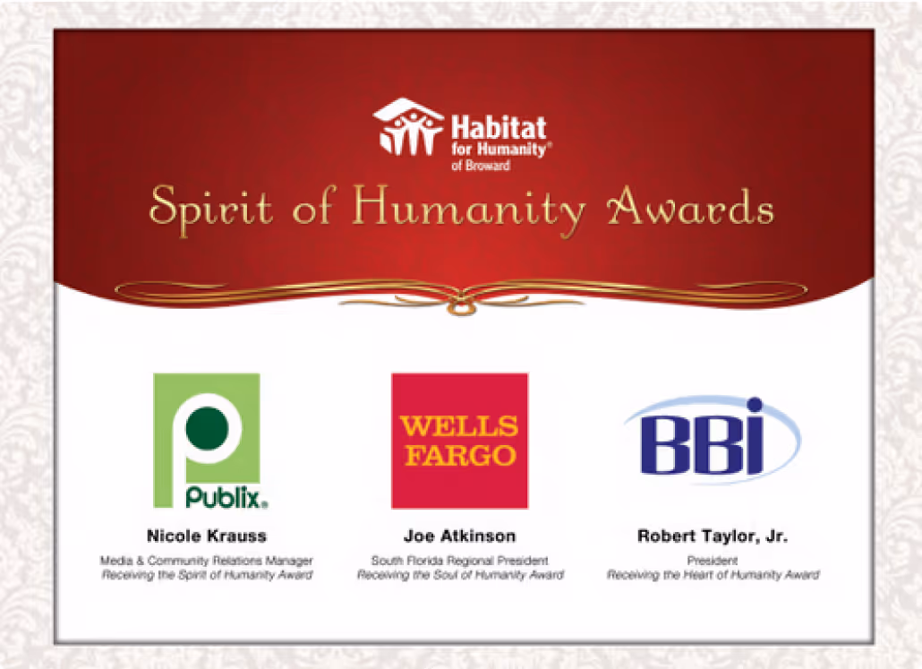 The Habitat Spirit of Humanity Awards celebrates Broward’s partners whose contributions have helped low-income families finance, build, and move into affordable homes.