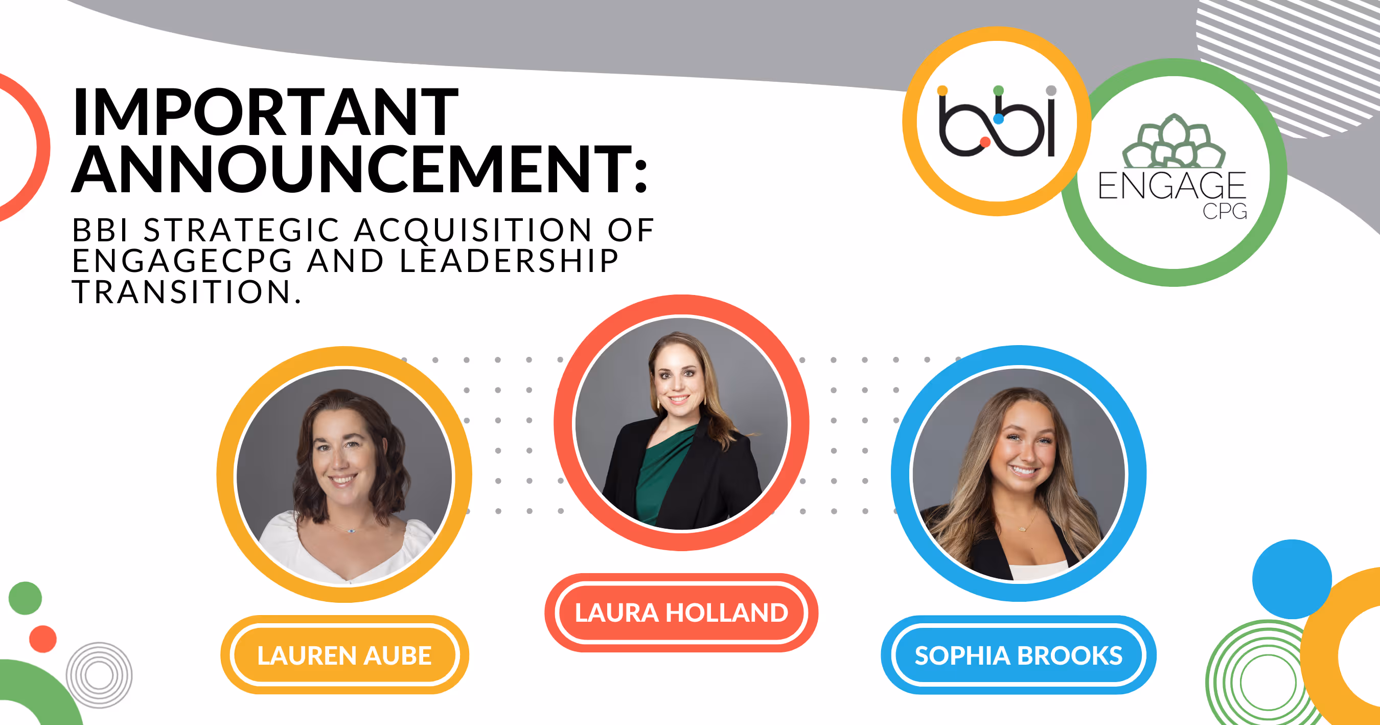 Burdette Beckmann Inc. (BBI) is pleased to announce a definitive agreement to acquire EngageCPG, a respected southeastern U.S. sales agency, effective January 1, 2025. This strategic acquisition will strengthen grocery partnerships by leveraging the combined expertise of both companies to enhance brand representation in the BBI Grocery channel. As part of the acquisition, BBI will integrate the entire EngageCPG team, including Laura Holland, Lauren Aube, and Sophia Brooks.